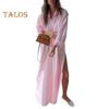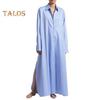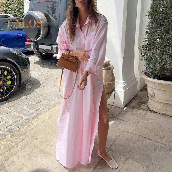 Enhance your wardrobe with this elegant shirt dress featuring a stylish slit design. Perfect for various occasions, this casual mid-length dress exudes a retro charm that is both fashionable and versatile.