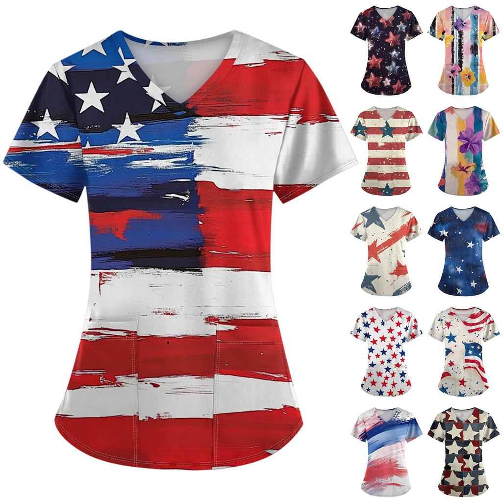 Women's Fashion V-Neck Short Sleeve Overalls With Pockets Independence Day Printed Tops Clothes