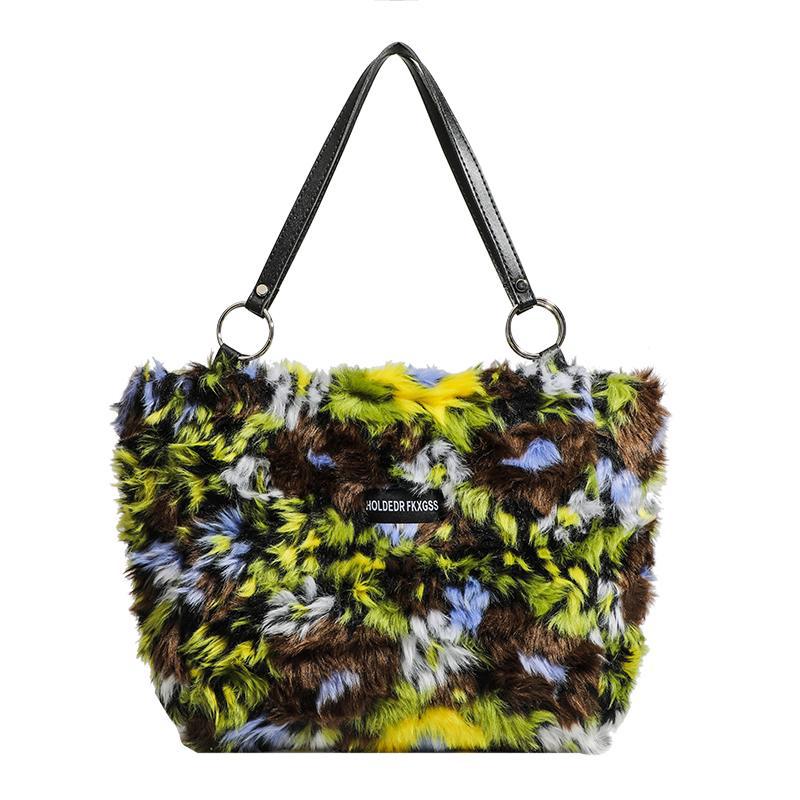 Eye - catching Appearance: This tote bag stands out with its vibrant, multicolored plush exterior, combining hues of yellow, green, blue, and brown. The black leather accents and straps add a touch of contrast and sophistication.
