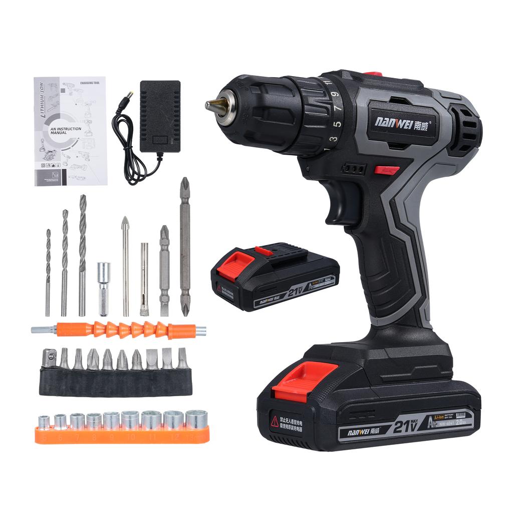 1 * Cordless Drill2 * Battery1 * Charger2 * Screwdriver Head3 * Fried Dough Twists Drill (3mm, 4mm, 5mm)1 * Tile Drill Bit1 * Opener1 * Drill Bit Extension Rod1 * Flexible Extension Shaft10 * Screwdriver and Drill Bit9 * Sleeve1 * Toolbox2 * User Manual (English)25+1 Gear Torque Adjustment with Dual Speed Control: The 25+1 gear torque adjustment provides precise control over the drilling and driving force, making it ideal for various materials like wood, metal, and walls. The dual speed control allows you to swi