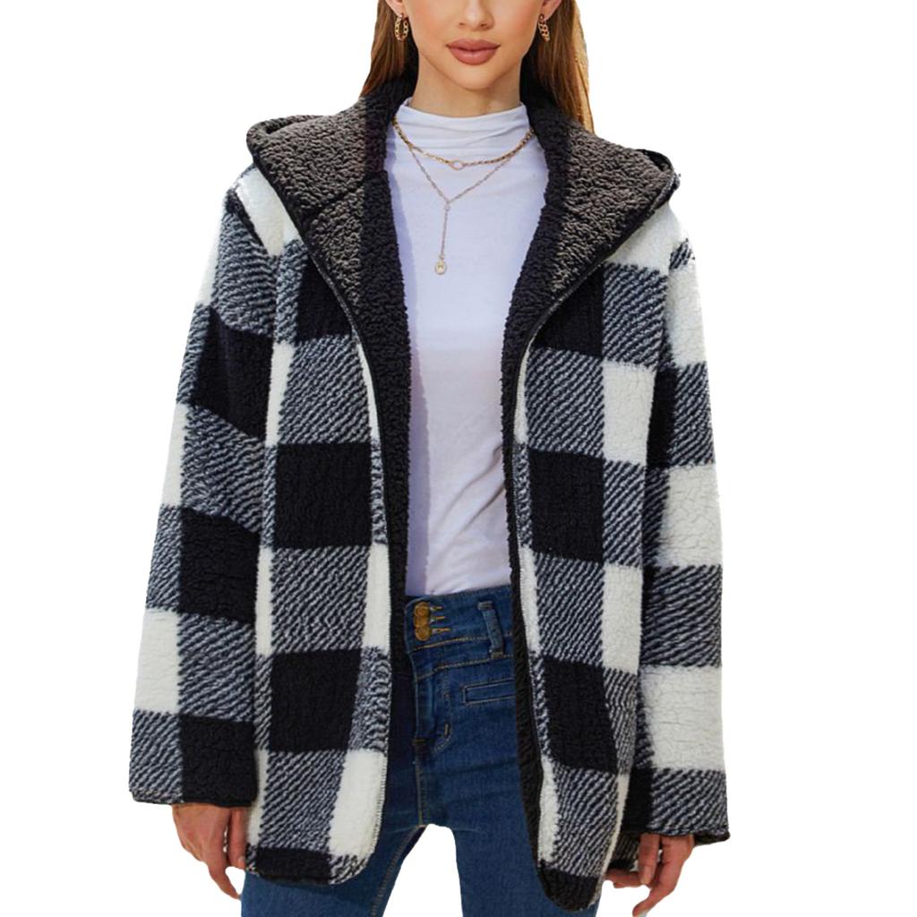 Plaid Plush Coat Open Front Loose Fitted Pocket Hoodie Double Side Plush Coat for Daily Life Black — buy online with free worldwide shipping!