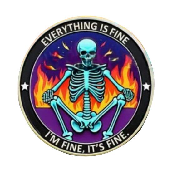 Introducing the challenge coin, a symbol of strength and resilience in the face of chaos. One side features a skeleton on a fired Dumpster, representing the forging power during extreme conditions. This design serves as a reminder that challenges can make us stronger. Crafted from high-quality alloy, this lightweight coin is easy to carry in your pocket, purse, or backpack. Whether displayed on a desk or kept close, it offers spiritual support and motivation when navigating life's obstacles. Embrace chaos with humor, calmness, and tenacity with the Dumpster Blaze coin by your side.