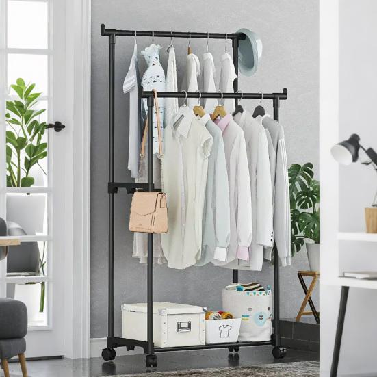 Featuring a double-rod structure, this rack offers ample hanging space for various items such as clothes, hats, and scarves simultaneously. Catering to diverse household needs, it optimizes storage efficiency and organization within a single unit.
