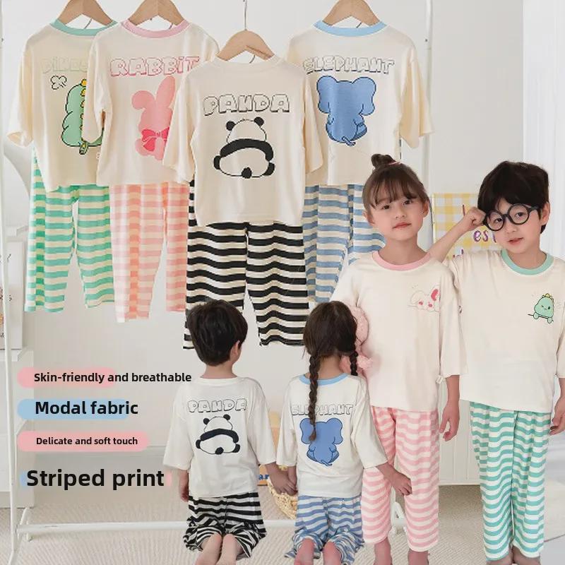 Introduce your child to ultimate comfort with this delightful children's cartoon pajama set. Crafted from soft modal material, these pajamas ensure a gentle touch on the skin, making them perfect for sensitive skin. The set features a fun and playful cartoon design that kids will love. Designed with practicality in mind, the pajama set includes 7/9-point air-conditioning pants, making it ideal for keeping your child comfortably cool during warmer nights or in air-conditioned settings. Perfect for a good night's sleep or lounging around at home, these pajamas combine style, comfort, and functionality.