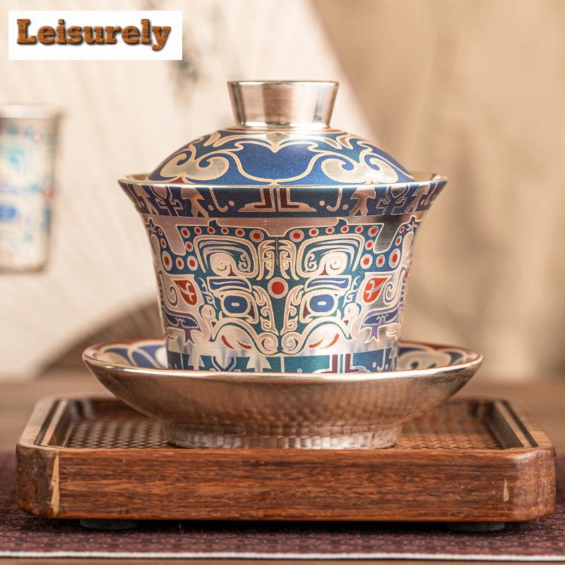 Handmade 999 Gilt Silver Gaiwan Taotie Pattern Three Talents Cup Saucer Tea Tureen Tea Brewing Cover Bowl Teaset Supplies Craft — buy online with free worldwide shipping!