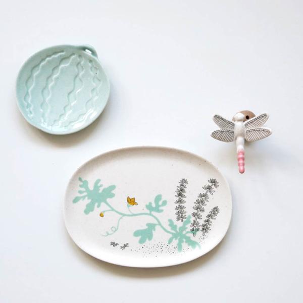It includes a practical main plate, a small accent dish with an embossed texture, and a dragonfly-shaped incense holder that adds charm and utility to your space.