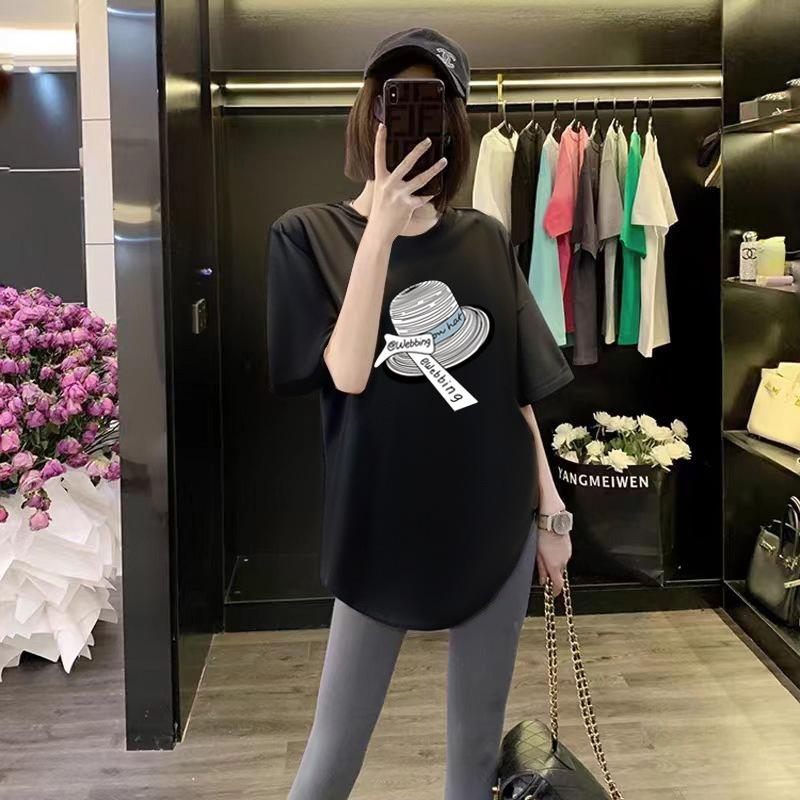 Butt Cover Top Loose Black Cotton Round Neck Short-sleeved T-shirt for Women In Summer Curved Hem Slit Medium Length — buy online with free worldwide shipping!