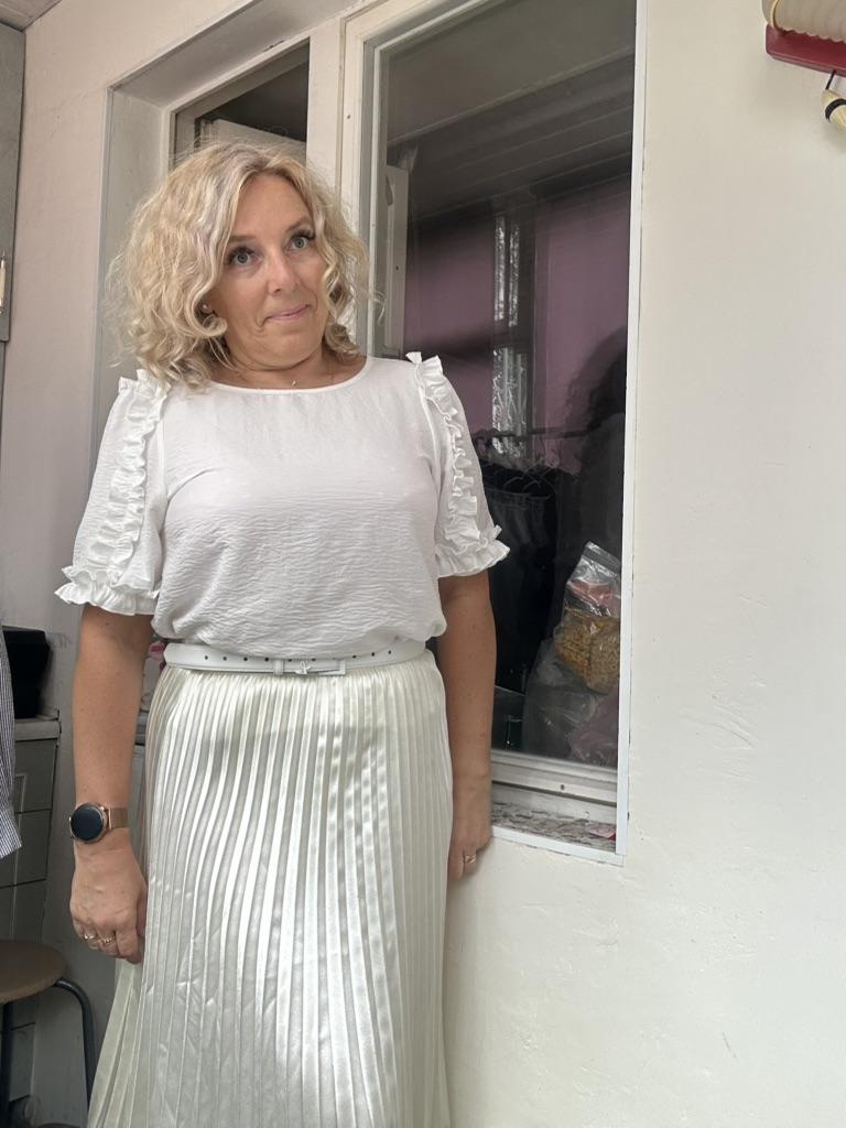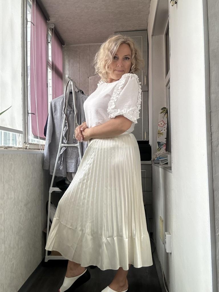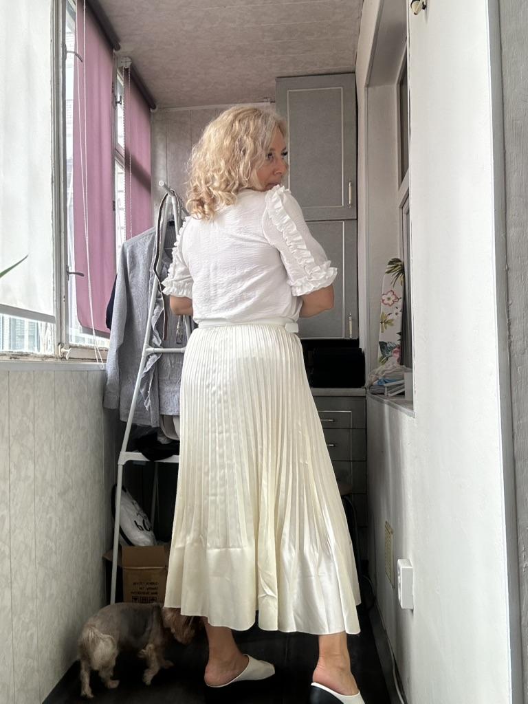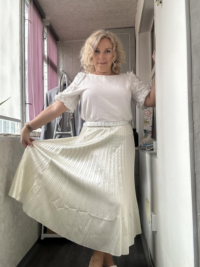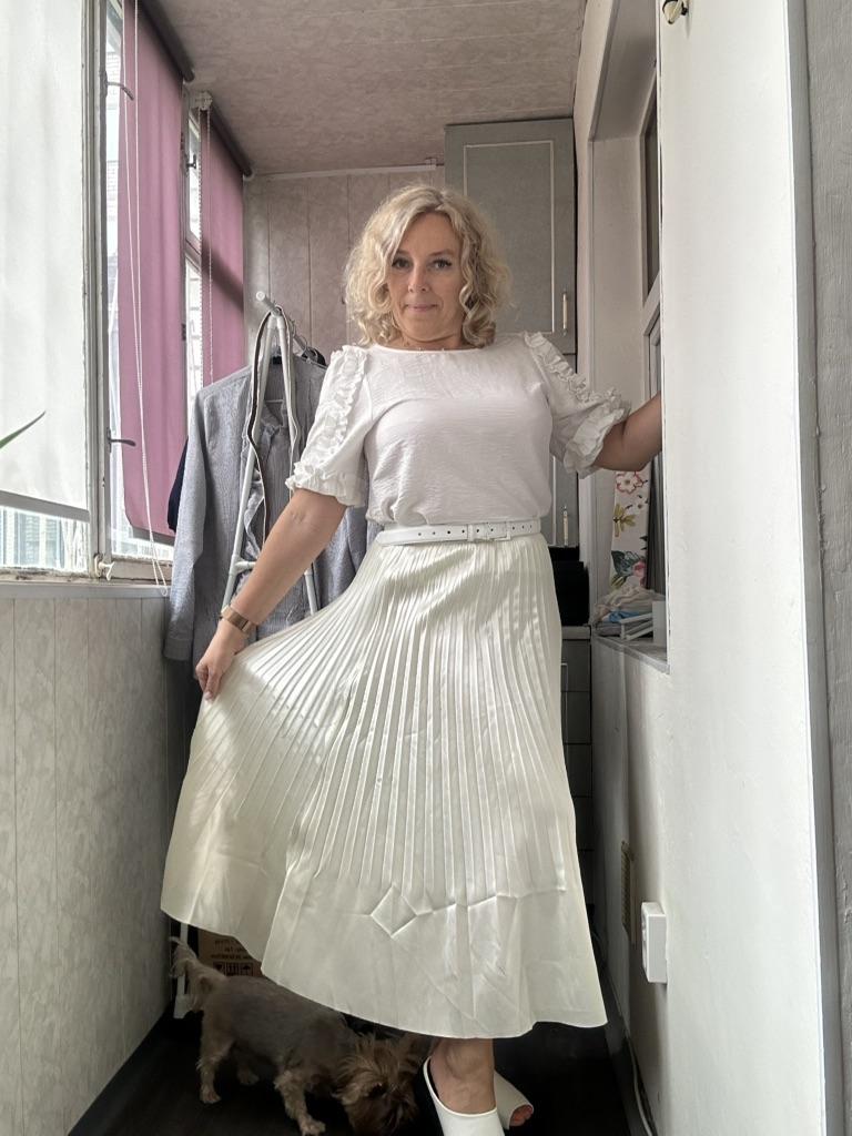 Skirt in cream color 👍👍👍 The pleated skirt is interestingly designed, the length of the skirt 💯💯💯 looks like a flounce at the bottom 😍😍😍 It shines 😎😎😎 I recommend ☀️☀️☀️