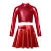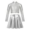 Girls Glossy Metallic Dance Set Long Sleeve Sequin Crop Top and Short Skirt Figure Skating Costume