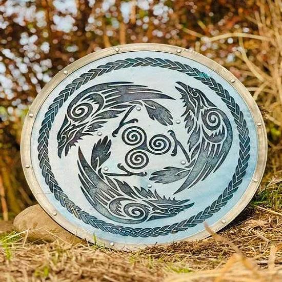 This Norse pagan warrior shield is more than just a prop—it’s a statement of strength and heritage. The wolf motif symbolizes loyalty and ferocity, while the Triskelion represents eternal motion and progress, deeply rooted in Celtic and Viking culture.