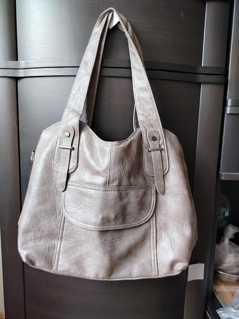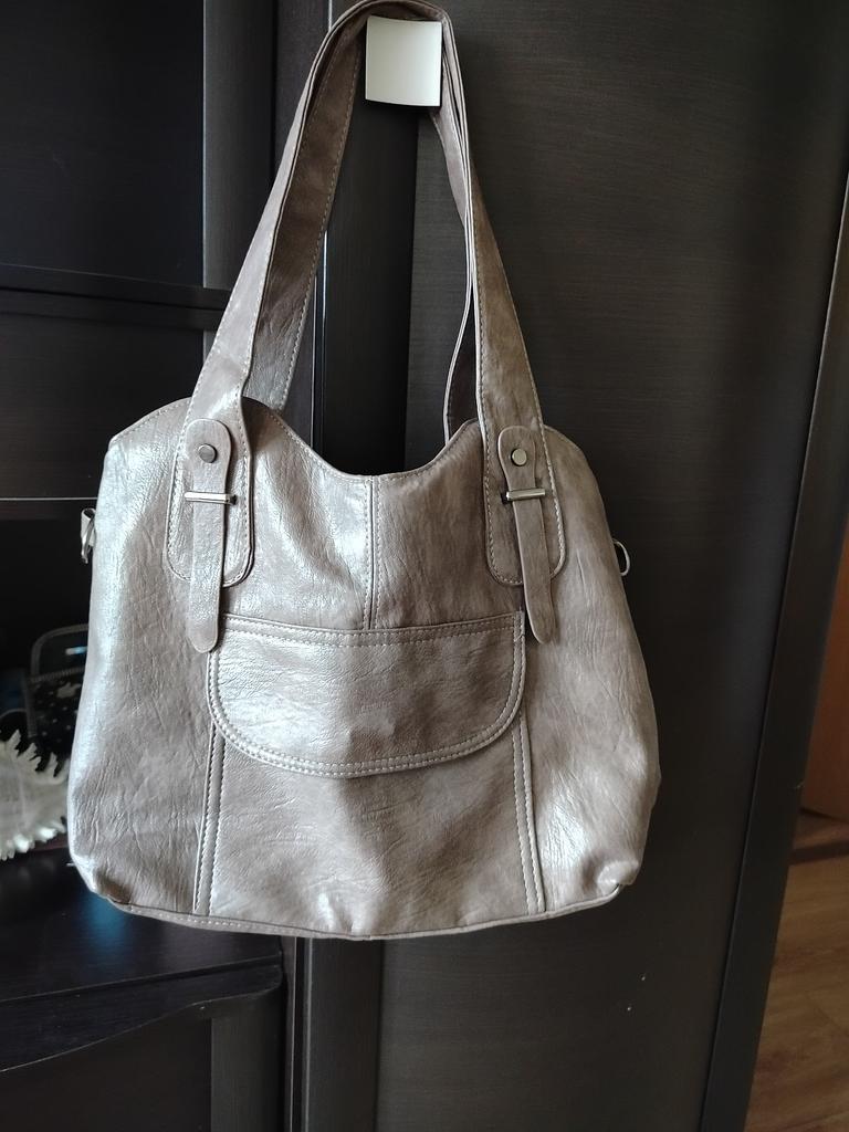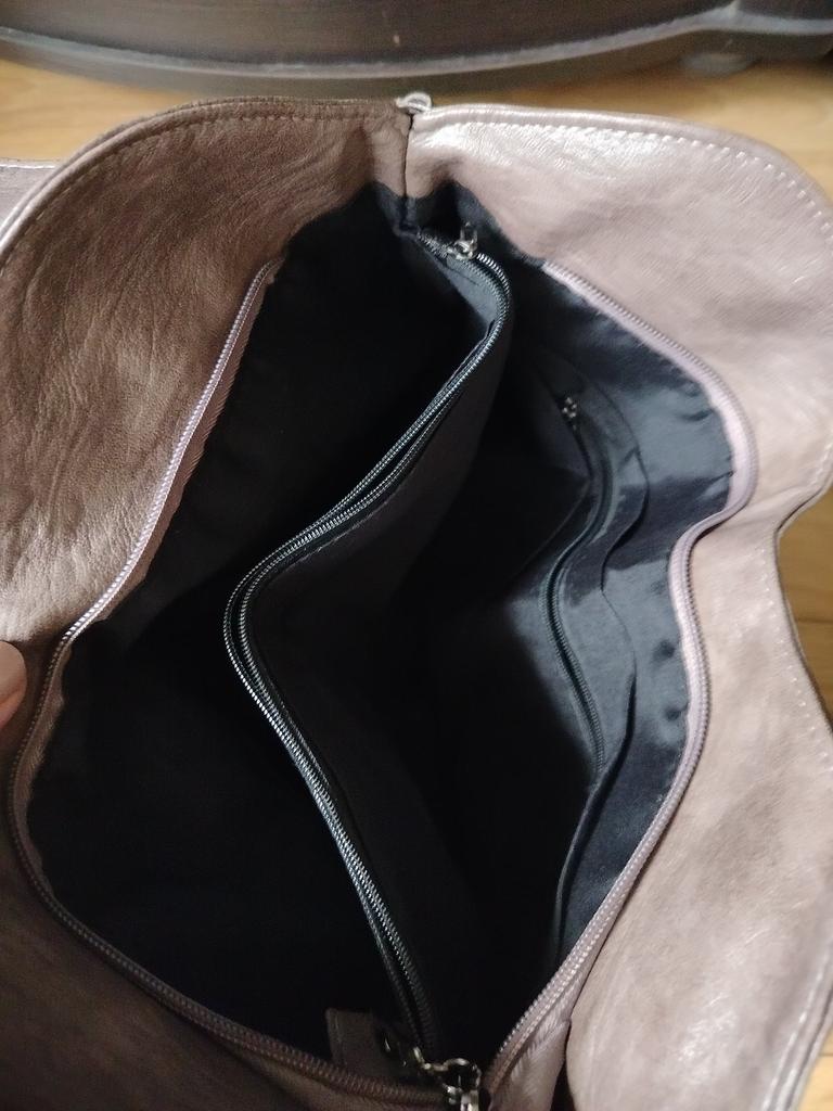 Very beautiful, soft. Inside there are two compartments and a third one with a zipper in the middle. There are pockets. There is a strap, but it is not needed, the handles are long and it can be worn on the shoulder. I expected the bag to be a bit stiffer, it is very soft, but for this money it is still excellent.