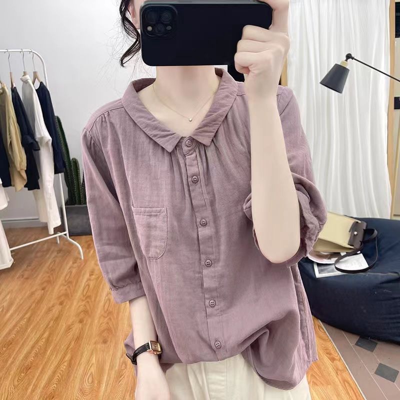 Summer Loose Three-quarter Sleeve Shirt Women's Casual Loose Solid Color Age-reducing Tops Retro Lapel Sunscreen Shirt