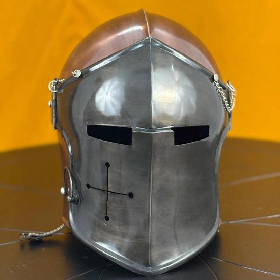 This two-tone copper grey barbuta helmet with visor is a wonderful example of historical accuracy and excellent craftsmanship. Handcrafted from high-quality 18 gauge steel, this helmet combines durability with a striking two-tone copper grey finish that evokes the spirit of medieval warriors. The beautiful patina adds to its enduring appeal, making it a coveted item a must-have for collectors, reenactors, and enthusiasts.