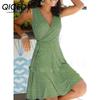QICED Polka Dot Print Dress Women Sleeveless Bandage Beach Dress Summer Bohemian Dresses For Women Casual V Neck Dresses Female Robe