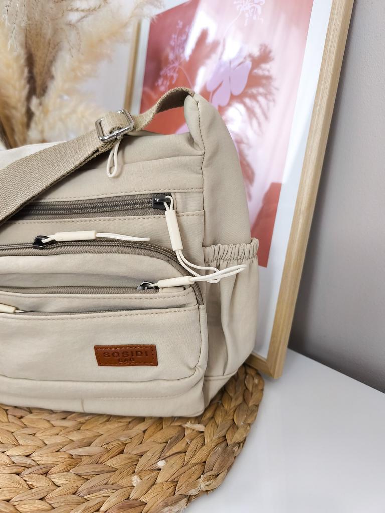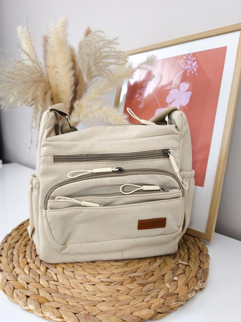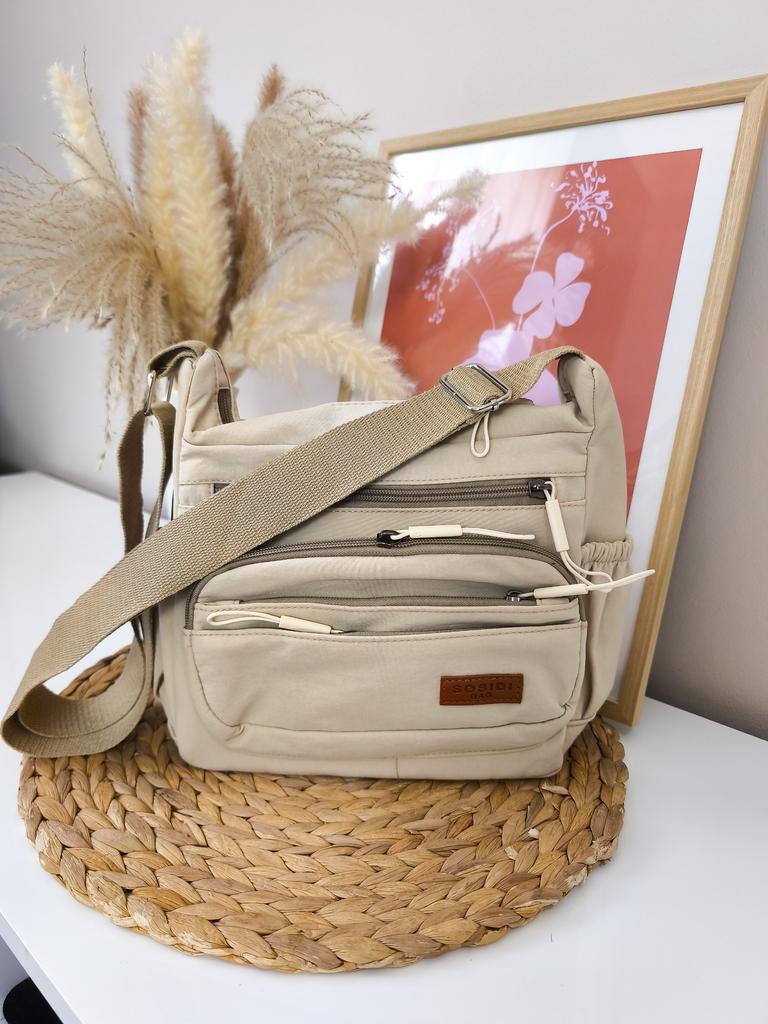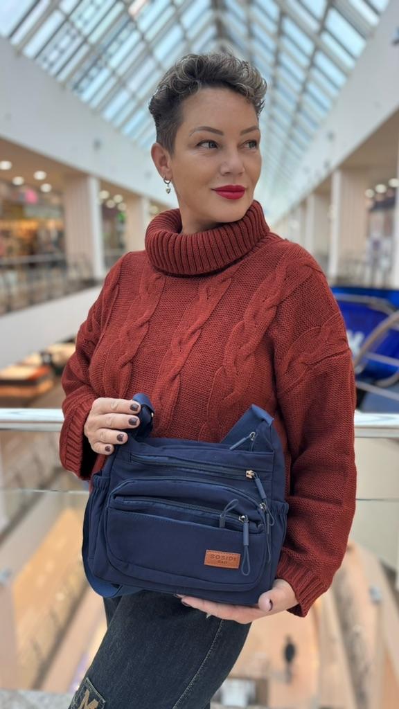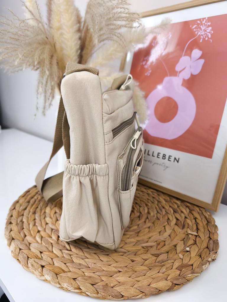 Women's bag sewn from durable fabric. Sizes: 25 x 13 x 20 cm. Comfortable functionally due to the large number of pockets. Has one main compartment with a zipper. Three zippered compartments on the front. Open-type elasticated pockets on the ends. This model is equipped with a non-removable, long, shoulder strap that, if necessary, is adjustable in length. Lining: Textile. Definitely recommend.👍