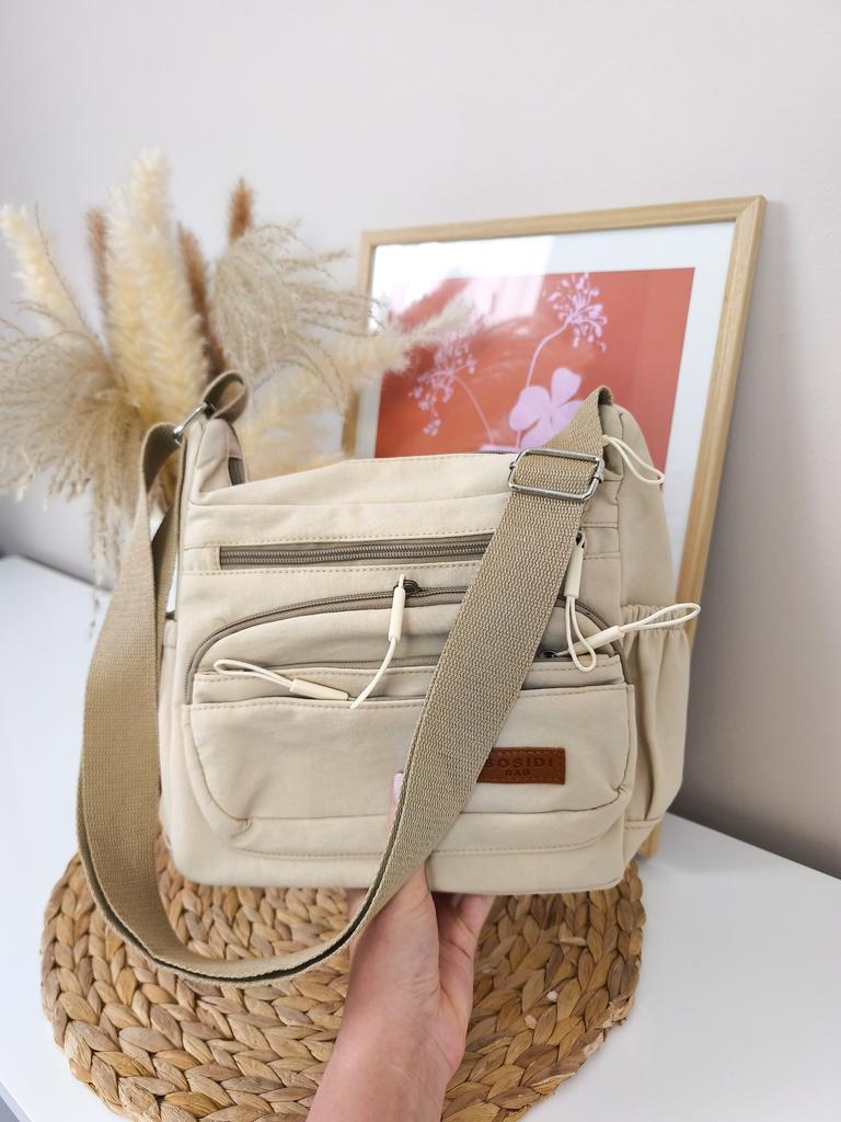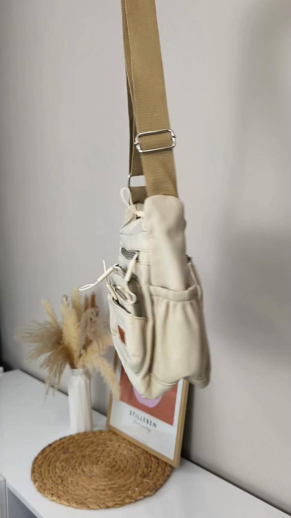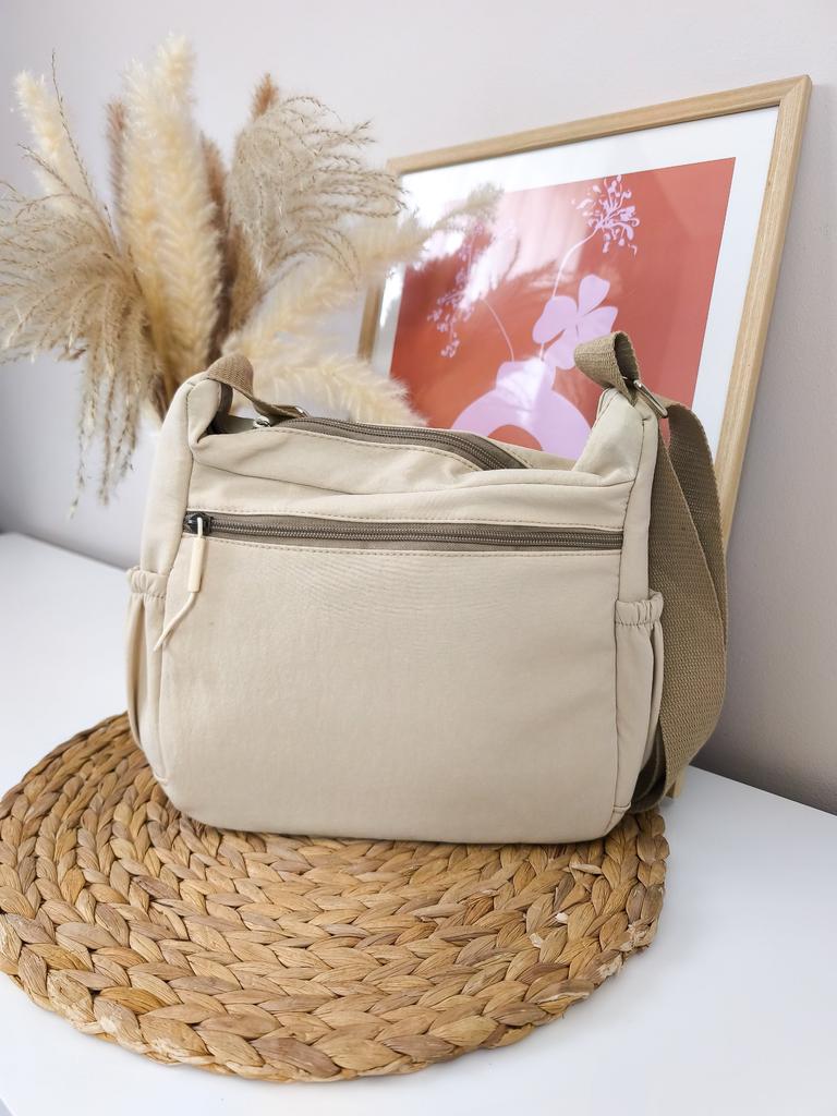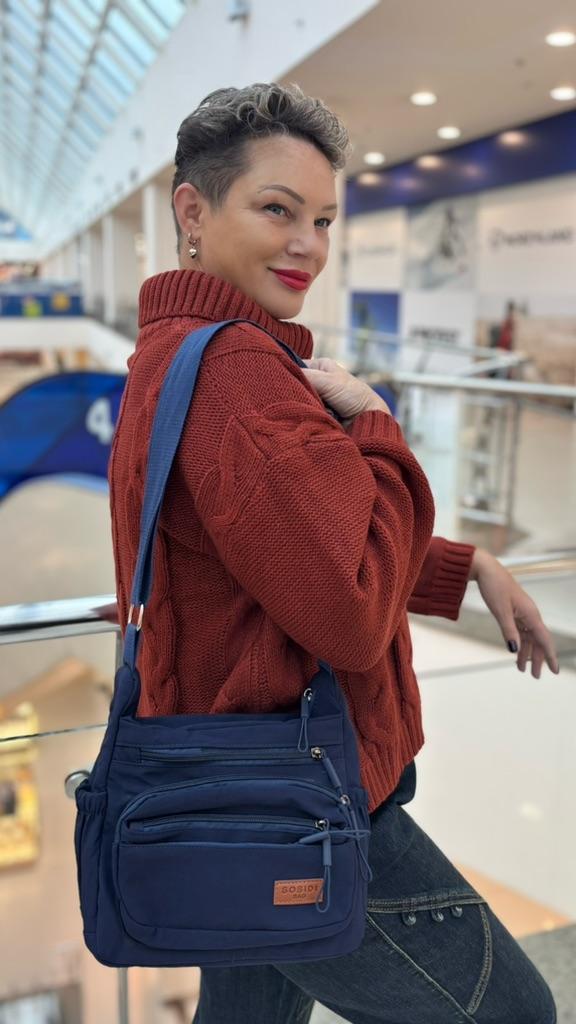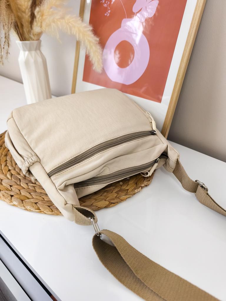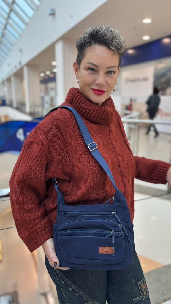 Women's bag sewn from durable fabric. Sizes: 25 x 13 x 20 cm. Comfortable functionally due to the large number of pockets. Has one main compartment with a zipper. Three zippered compartments on the front. Open-type elasticated pockets on the ends. This model is equipped with a non-removable, long, shoulder strap that, if necessary, is adjustable in length. Lining: Textile. Definitely recommend.👍