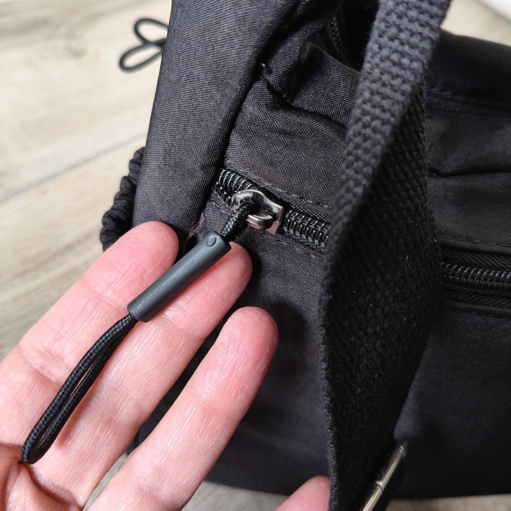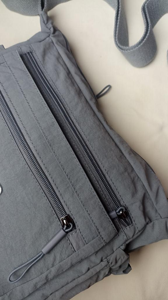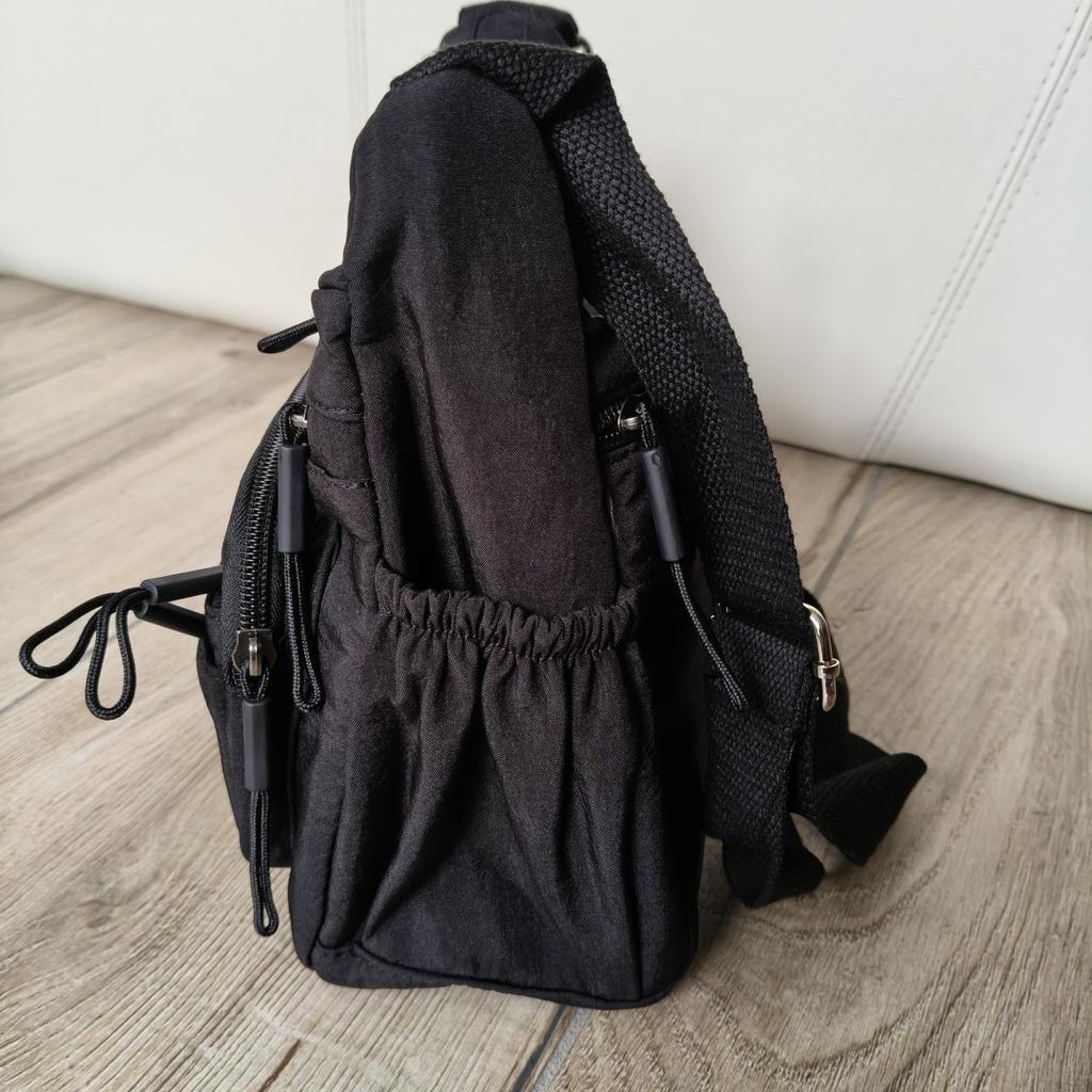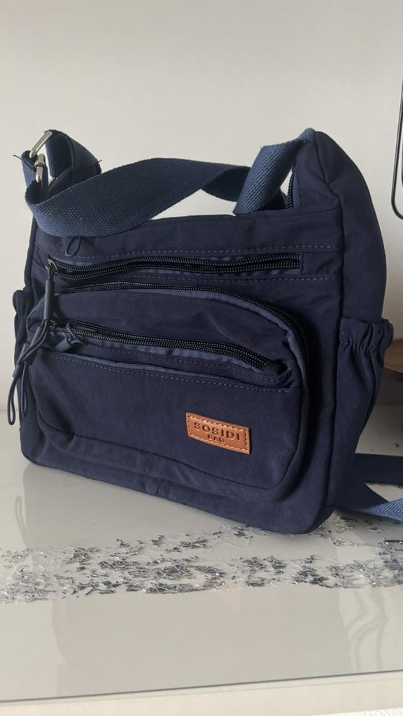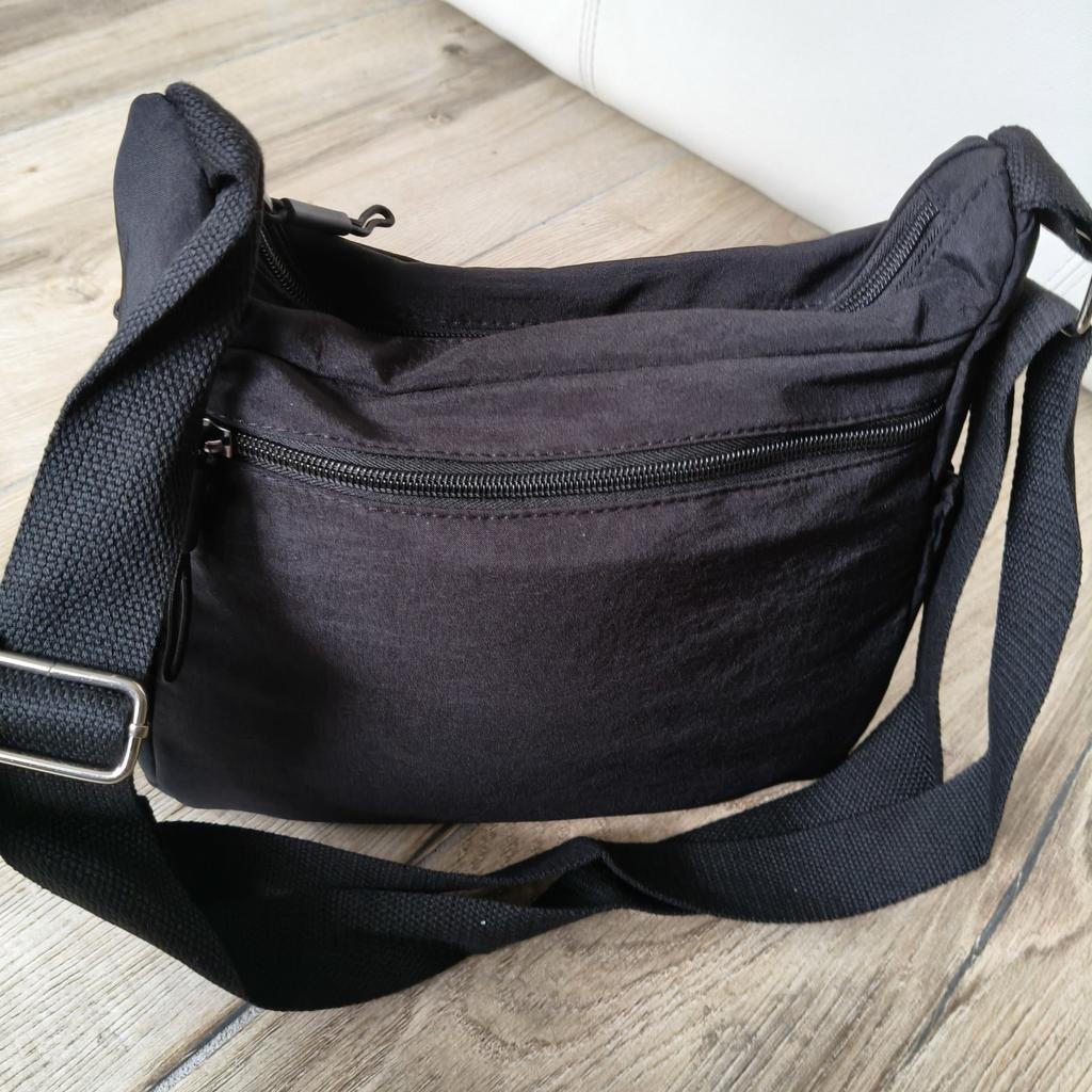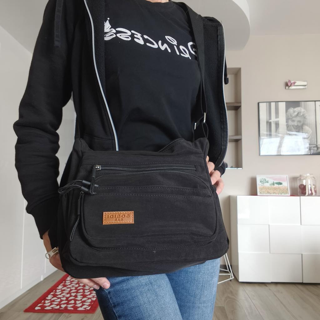 SHOULDER BAG small shoulder bag equipped with a non-removable but adjustable canvas shoulder strap. The bag has 2 internal pockets, one with a zipper and one open pocket (for a smartphone, for example). On the outside, on both sides, there are 5 pockets closable with a zipper and 2 small open pockets gathered with elastic.. Available in various colors . I chose the color black. Material: fabric of good thickness water-repellent and washable ,the bag is lined. The seams are neat, no bad smells. Arrived in Italy in 20 days with tracked shipping. Packaging: cellophane wrap. Recommended purchase 👌