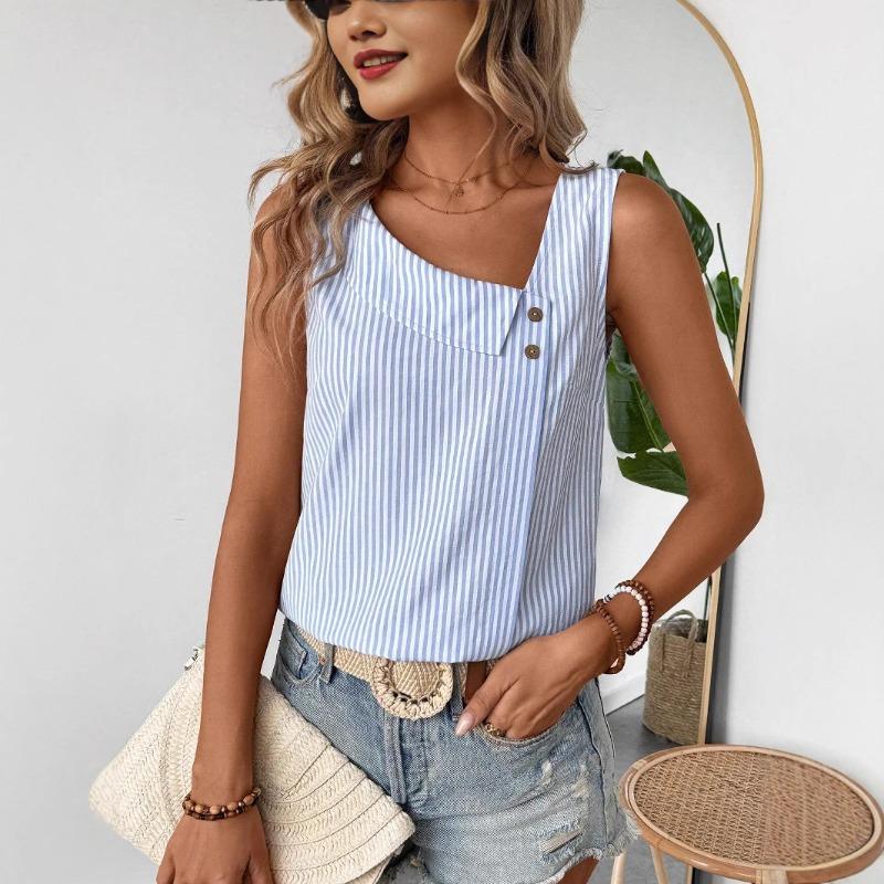 New Women's Casual Sleeveless Striped Top T-shirt with A Slanted Collar — buy online with free worldwide shipping!