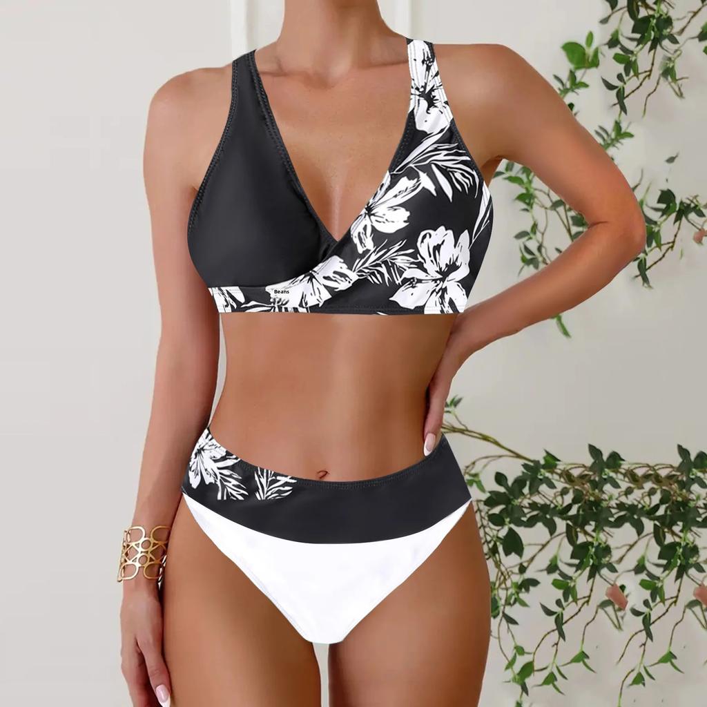 Women's Halter Two Colored Flowers Print Bikini Tankini Swimsuit — buy online with free worldwide shipping!