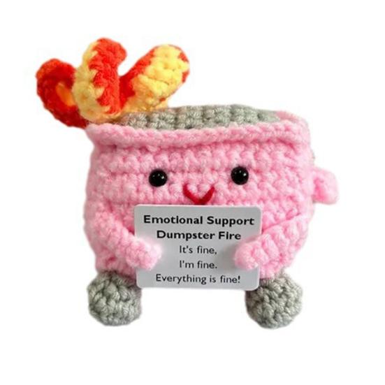 With its quirky design featuring a flaming trash can, this crocheted piece is ideal for those who appreciate a lighthearted approach to life's chaotic moments. Whether as an emotional support gift, a token of gratitude, or a fun desk decoration, this crocheted dumpster is guaranteed to bring a smile to anyone's face.