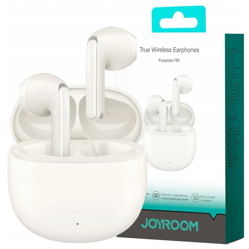 Wireless Headphones Joyroom Funpods JR-FB1 (white)In a world full of rhythms and sounds, the Joyroom JR-FB1 Black wireless headphones are the perfect combination of technology, comfort, and style.. Equipped with the latest version of Bluetooth 5.3, they offer exceptional sound quality according to AAC and SBC decoding, ensuring the smoothness and clarity of every note. Thanks to their ergonomic design, long battery life, and IP54 water resistance, they are not only practical but also a reliable companion for every day.Advanced Bluetooth TechnologyThe modern Joyroom JR-FB1 headphones are equipped with the latest Bluetooth 5.3 version, ensuring a stable and fast connection at a distance of up to 10 meters. Thanks to this, you can enjoy music without interruptions, even while moving around the house or office.. This technology also guarantees lower audio transmission delays, which is particularly important when watching movies or playing games.High sound qualityThanks to the BT codecs AAC and SBC, the headphones offer excellent sound quality. Thanks to this, you can experience deep bass, clear sopranos, and clearly defined mid-tones.. This makes every note sound exactly as it should – pure and flawless.Long battery lifeThe JR-FB1 Black headphones have an impressive music playback time of 7 hours on a single charge and a total playback time of up to 35 hours with the case. Such a long working time makes the headphones ideal for people who are constantly on the move and do not want to be limited by the constant charging of the device.Durable construction and water resistanceIn addition to excellent sound quality, the Joyroom JR-FB1 headphones are also waterproof to IP54 level, which makes them an ideal choice for active users. You can use them during exercise, running, or even in light rain without worrying about damage.. From today, nothing will limit you!Wearing comfortJoyroom headphones were created with wearing comfort in mind, which is reflected in the low weight of the headphones – only 3 g. Thanks to this, wearing them for a long time does not cause discomfort, and their ergonomic shape perfectly adapts to the shape of the ear.. Now you can listen to your favorite music even during a very long journey!Manufacturer JoyroomModelJR-FB1Color WhiteBluetooth version 5.3Bluetooth codecsAAC, SBCSupported protocolsHSP, HFP, A2DP, AVRCPOperating frequency2402-2480 kHzHeadphone battery capacity35mAhCharging case battery capacity400 mAhSpeaker impedance32ΩRated power2*3mWSpeakerΦ13mmMusic playback time7 hours (70% volume)Total playback time35 hours (70% volume)Talk time5 hours (70% volume)Headphone standby time (connected)about 48 hoursHeadphone charging input5V⎓200mACharging case input5V⎓1ACharging input portType CHeadphone charging timeabout 1.5 hoursCharging case charging timeabout 1.5 hoursWater resistanceIP54MaterialABS+PCWeight of headphones3gNet weight34g