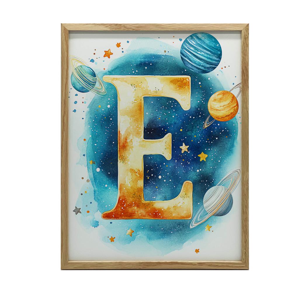 1x Kosmiczna Litera E - Plakat Dekoracyjny do Pokoju Dziecięcego, 30x40 cm, rama aluminiowa złota, papier matowy 230 gsm