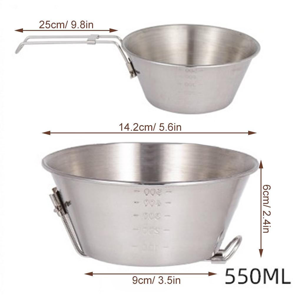 Product name: folding handle bowlSize: 9x6cm550ML (large size)Weight: about 117g (large size)Style: Folding handleMaterial quality: 304 stainless steelApplication: outdoor camping, barbecue, home use, etc...