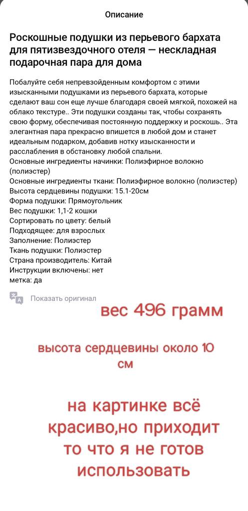 I wanted to update my pillow, it has become not as fluffy as when purchased in 5 years. And I received the same thin pillow, not as described. I am disappointed. 😥😥😥. The product description says weight 1.1, thickness twice as much. But in reality, I receive some kind of thin crap