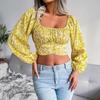 Spring Summer Floral Chiffon Crop Blouse Square Neck Lantern Sleeve Bow Resort Top S-XL — buy online with free worldwide shipping!