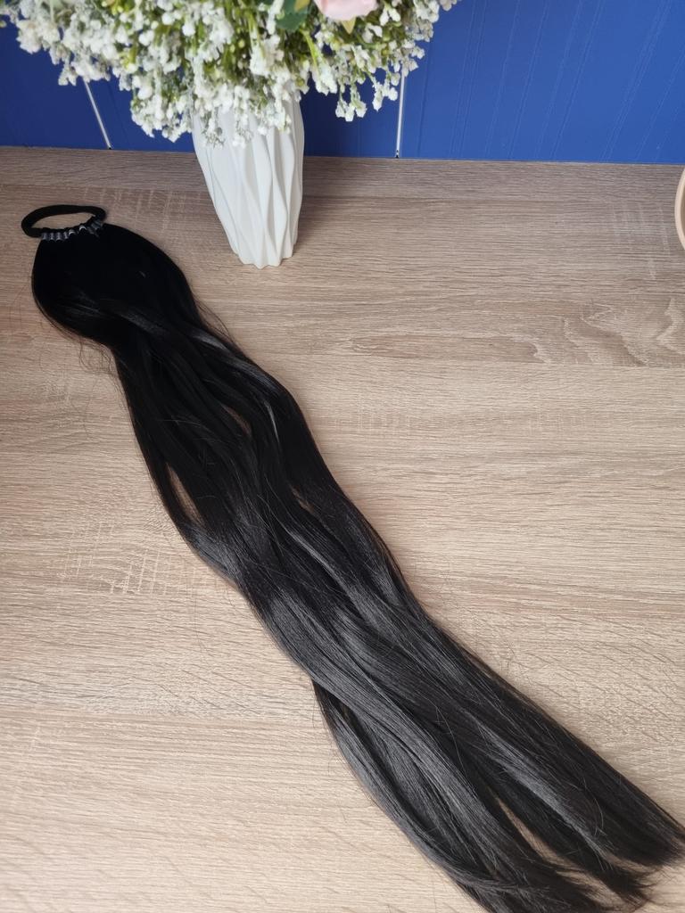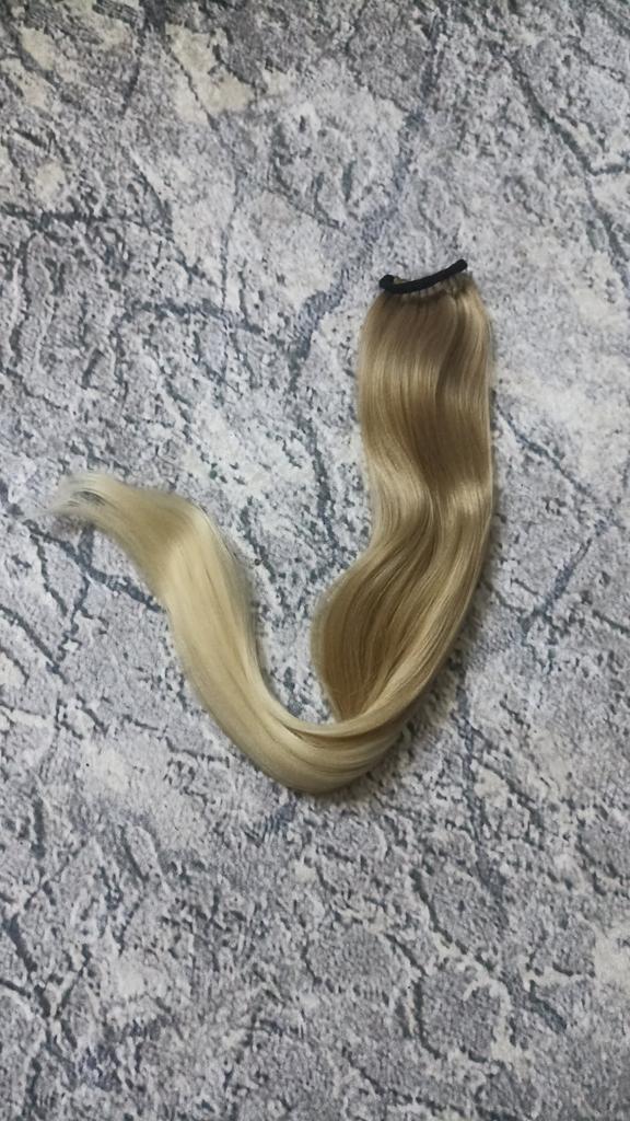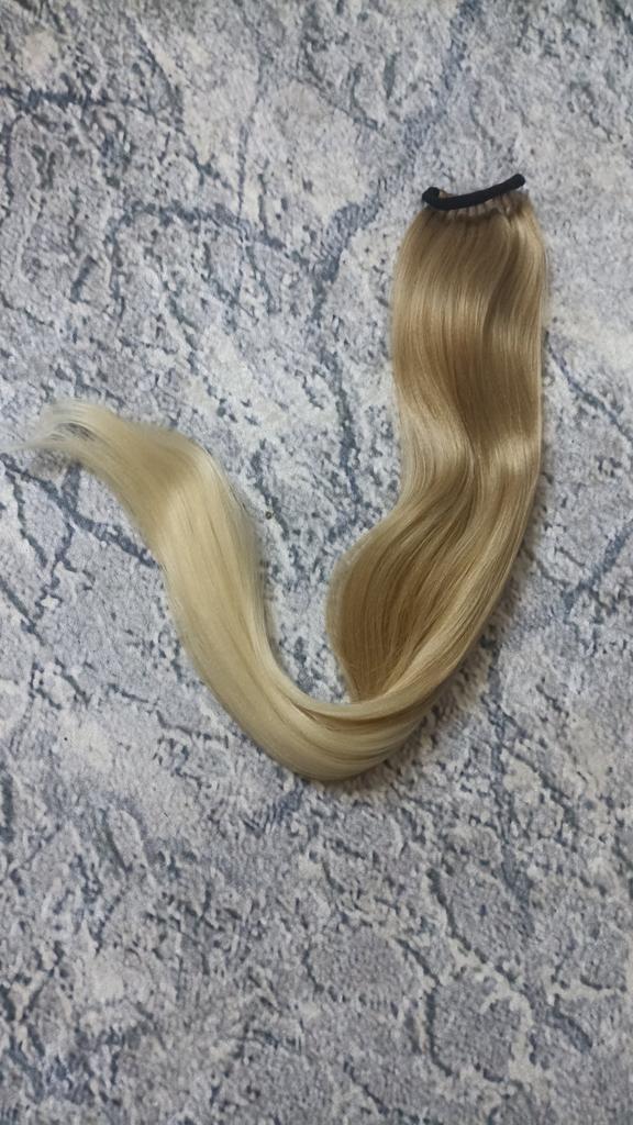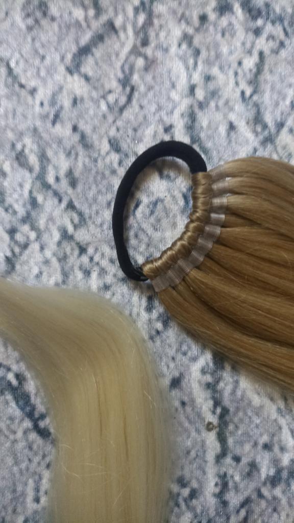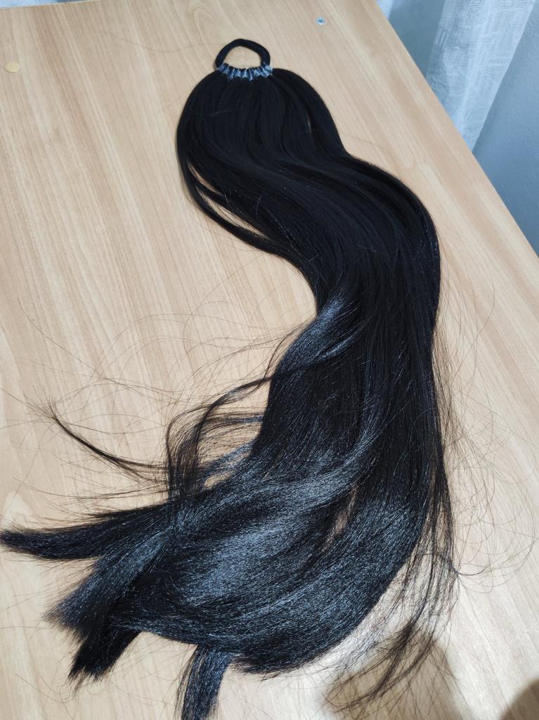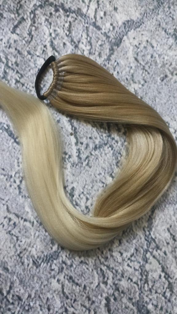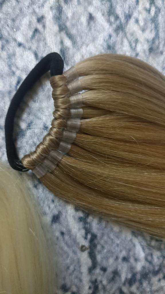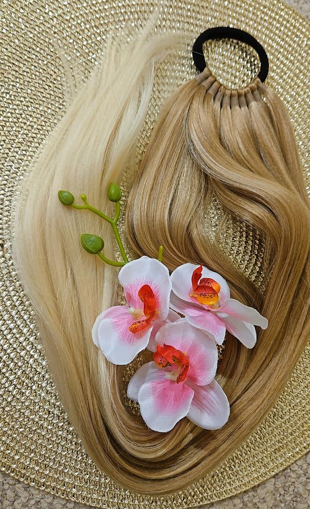 Clip-in ponytails can be used for photoshoots, events in everyday life. Lightweight and comfortable to use Hair attached to an elastic band. Attachment method: tie your hair into a ponytail, wrap an elastic band around it several times, wrap one of the strands around the elastic band to hide it How to care for it: can be washed in warm soapy water, dried naturally. Can be combed (gently, starting from the bottom of the hair and gradually moving upwards). In case the hair is very tangled, it can be untangled with the help of ironing. Tangling occurs due to the loss of the even structure of the hair, and the more you try to comb through the strand - the more it deforms, becoming like an accordion. Run the iron over the strand, thereby straightening the hair, and then comb through it. Do this until the hair regains an even structure.