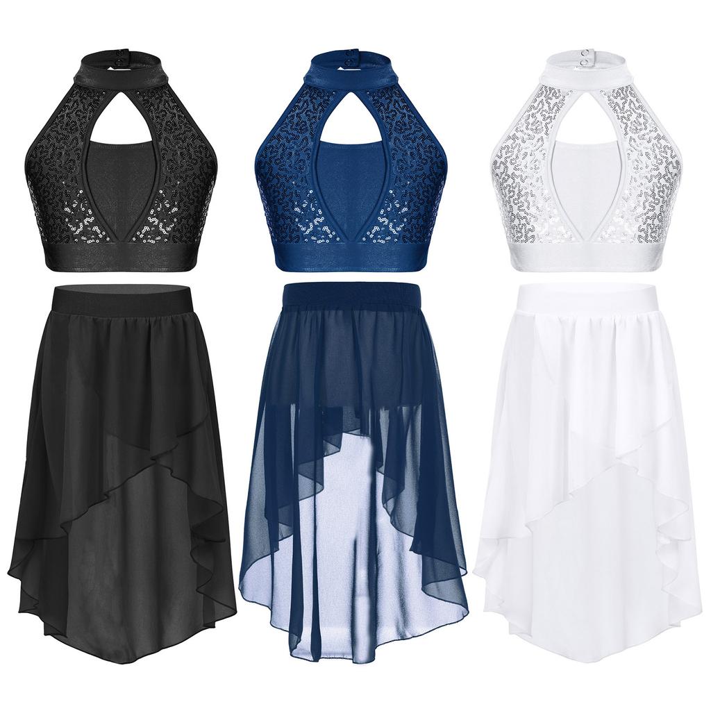 Kids Two Piece Performance Costume Sequin Crop Top Hollow Front Keyhole Back Irregular Chiffon Skirt Dance Outfit Set — buy online with free worldwide shipping!