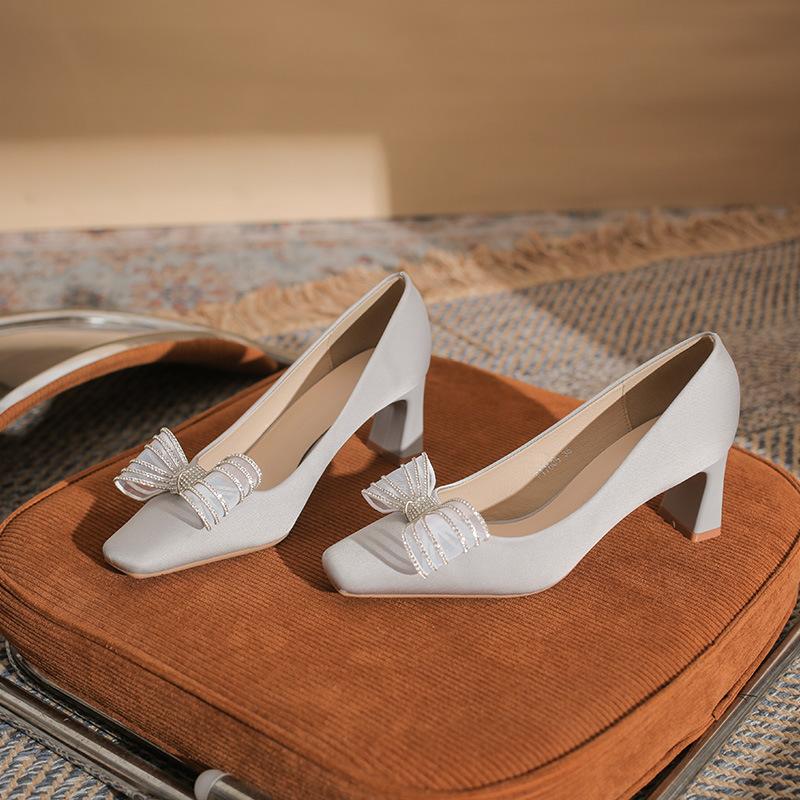 B Temperament Square Head Thick Heel Women's Wedding Shoes New Bow Versatile Comfortable Single Shoes Women