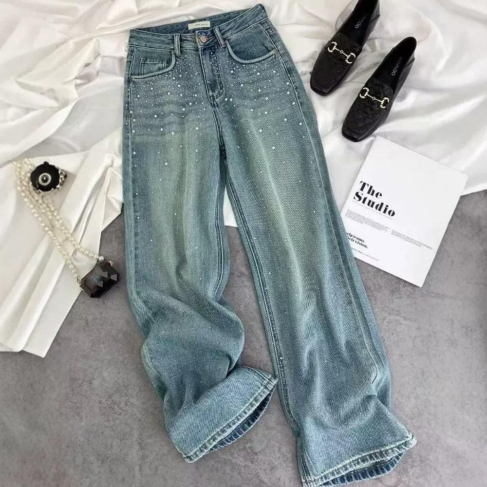 Retro Washed Diamond-encrusted Jeans Women's Spring Design Sense High-waisted Straight-leg Pants Loose Wide-leg Mopping Pants — buy online with free worldwide shipping!