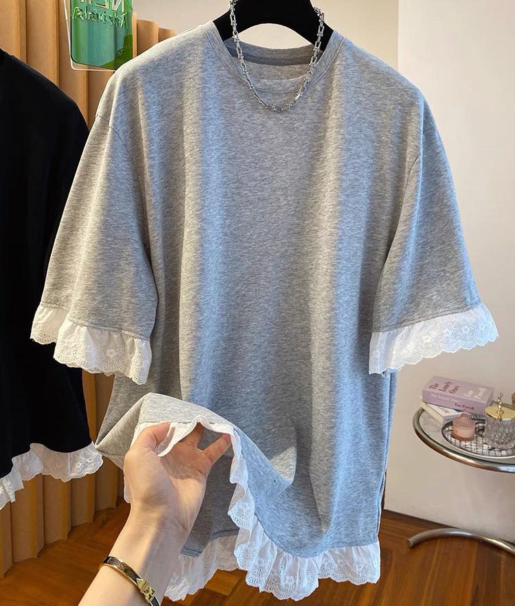 Plus Size Women Korean Style Short Sleeve T-Shirt Loose Fit Lace Splice Half Sleeve Tops Summer Cotton Crew Neck T-shirts — buy online with free worldwide shipping!