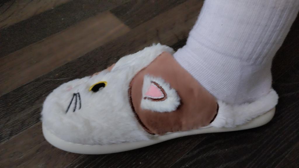 The size corresponds to the sole. But, so that the "back" does not fold down, the foot should be one size smaller (my size is 36.5, the "back" folds down and the slippers turn into flip-flops). The sole does not slip. The slippers are warm. Cute kittens. It's a pity that the ears were bent forward during delivery. Although, there is a feeling that they were simply sewn on carelessly.