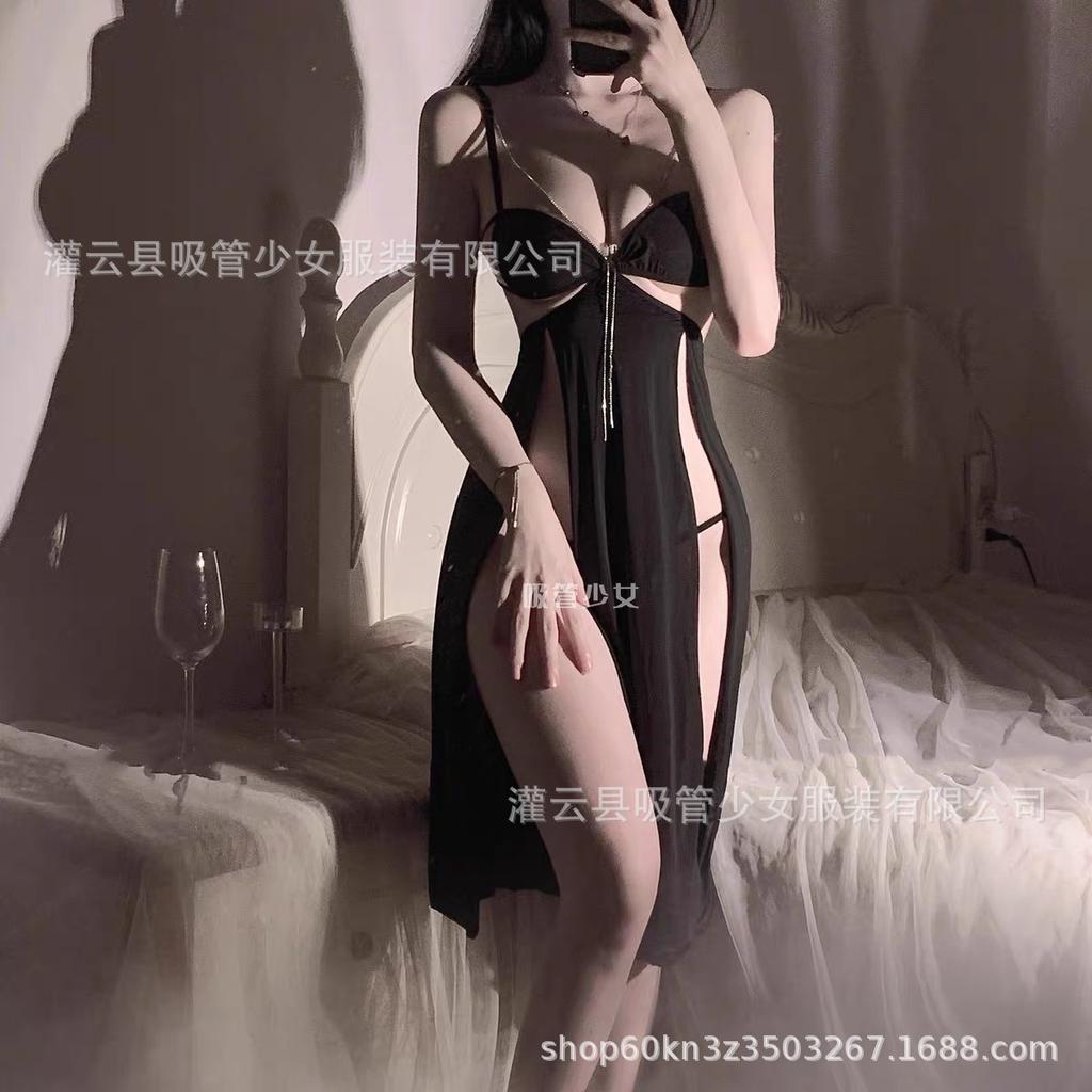 Sex Underwear Suspender Rhinestone Chain Deep V Slit Hollowed Sexy Long Dress Niche Chest Chain Scheming