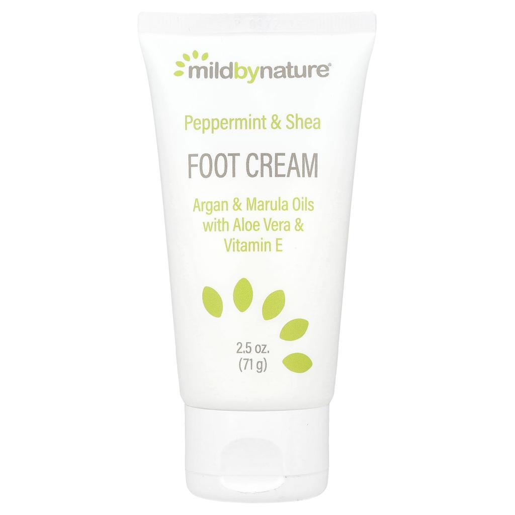 Product Description: Mild by Nature® Peppermint & Shea Foot CreamWith Argan & Marula Oils, Aloe Vera & Vitamin EPremium oils of Rosehip, Avocado, Coconut, Jojoba & OlivePH Balanced & Cruelty FreeFor Soft, Smooth & Healthy-Looking SkinNo Parabens, Phthalates or Dyeing AgentsNo FragrancesMade in the USA from Imported IngredientsWhen the stress of everyday life builds up on our feet, it can leave them feeling tired, dry and uncomfortable. Mild by Nature® Peppermint & Shea Foot Cream is the perfect way to care for your feet after a hard day. This highly concentrated, moisturizing cream soothes and heals rough, cracked feet and heels. Formulated with hydrating Shea Butter and Peppermint, Argan & Marula Oils, this cream calms the senses and soothes skin. Made with a premium blend of carefully selected oils, including avocado and coconut oils rich in essential fatty acids, the formula refreshes the skin and provides nourishment and moisture to keep feet soft and healthy.