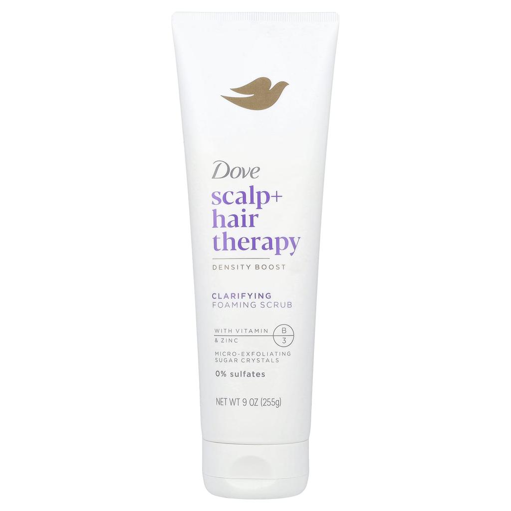 Product Description: Hair Density Booster With Vitamin B3 and Zinc Micro-Exfoliating Sugar Crystal Sulfate 0% PETA Approved - Global Vegan Animal Testing Policy Developed with Dermatologists Did you know that 99% of your hair’s natural nourishment and strength comes from your scalp? Developed with dermatologists and Dove skincare expertise, Dove Scalp + Hair Therapy Collection treats your scalp, the source of beautiful hair growth. Create thicker, stronger, fuller hair from root to tip. Contains Vitamins B3, E, Zinc, Peptides, and the Scalp + Hair Therapy Density Boost Collection Scalp Care + Root Nourishment + Fiber Boost Maximize your benefits with our complete regimen Exfoliation Purifies Hydrates Density Purifying Foaming Scrub Gently cleanses, rebalances your scalp, and unclogs pores. Micro-exfoliating sugar crystals remove excess dead skin cells and easily dissolve without leaving behind any residue.