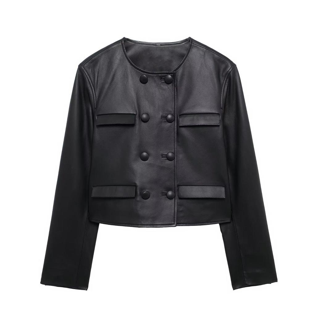 2025 Spring Women's Simple Round Neck Short Leather Jacket with Button Embellishments — buy products online with free worldwide shipping!