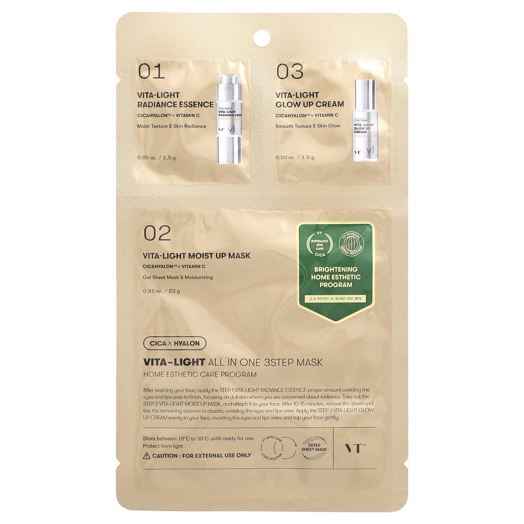 After washing your face, apply an appropriate amount of Vita-Light Radiance Essence, avoiding the eye and lip areas. Finish by focusing on dull skin that needs a boost of radiance. Step 2: Remove the Vita-Light Moist-Up Mask and place it on your face. After 10-15 minutes, remove the mask from the eye and lip areas and pat the remaining essence for absorption. Step 3: Apply Vita-Light Glow-Up Cream evenly over your face, avoiding the eye and lip areas, and gently pat.
