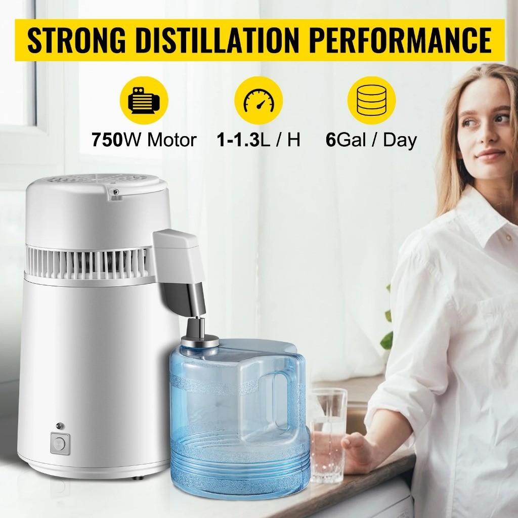 The 750W distilled water maker speeds over 0.34 gal/1.3 L per hour to remove most tap water impurities like VOCs, dissolved solids, and almost all other contaminants. It can distill a total of 8.24 gal/31.2 L per day, and in order not to affect your taste, we kindly recommend that you change the filter carbon pack once a week.