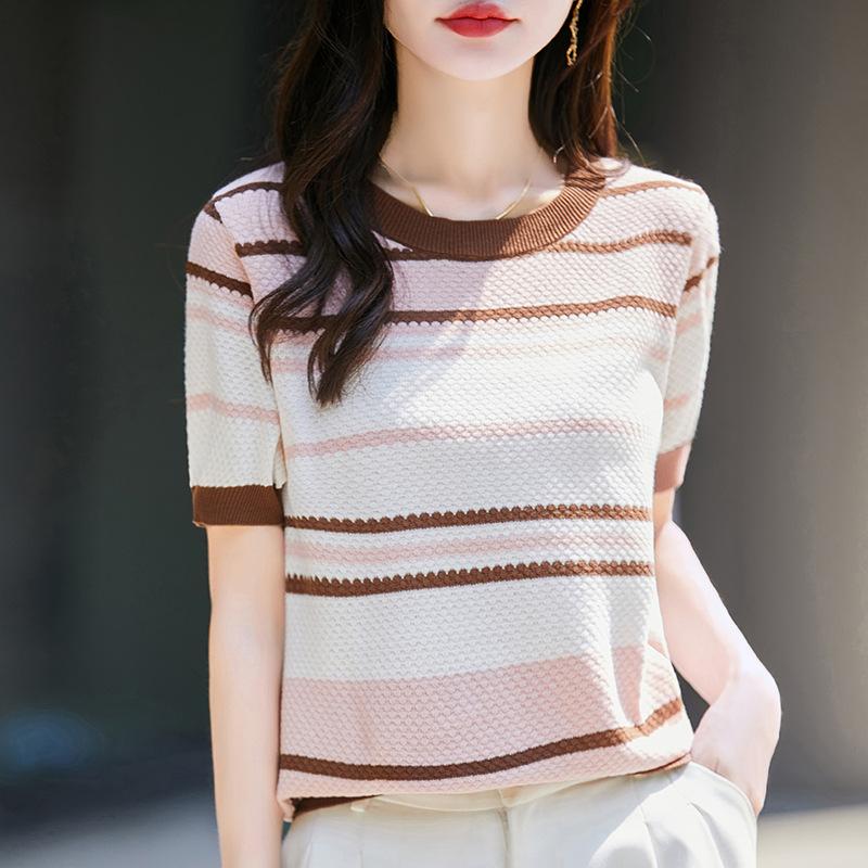 Summer New Women's Cotton Striped Crew Neck Knitted Sweater Fashion Versatile Short Sleeve Pullover T-Shirt Top — buy online with free worldwide shipping!