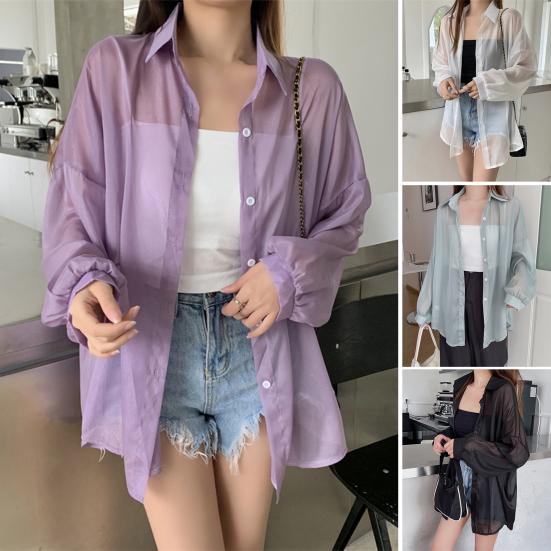 Style: Embrace a chic and relaxed look with this loose-fitting, see-through pearlescent chiffon shirt featuring long sleeves. The versatile design makes it a wardrobe essential for women seeking both style and comfort.
