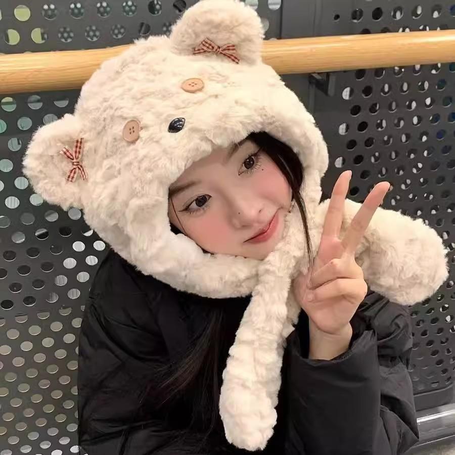 Cartoon Bear Plush Hat Autumn and Winter Scarf Hat Integrated Thickened Windproof Warm Scarf