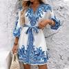 Women's Fashion Printed V-Neck Seven Sleeve Tie Waist Dresses