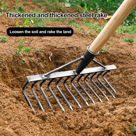 Introducing the Steel Garden Weeding rake, a durable and reliable tool crafted from sturdy steel to tackle even the toughest soil environments. This rake is designed for efficiency, swiftly processing weeds and compacted soil in flower beds, gardens, and vegetable fields. With sharp reinforced teeth, it effortlessly tears apart stubborn roots, making weeding a breeze.