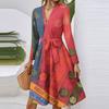 Women's Fashion Casual V-Neck Long Sleeve Waist Floral Print Midi Dress