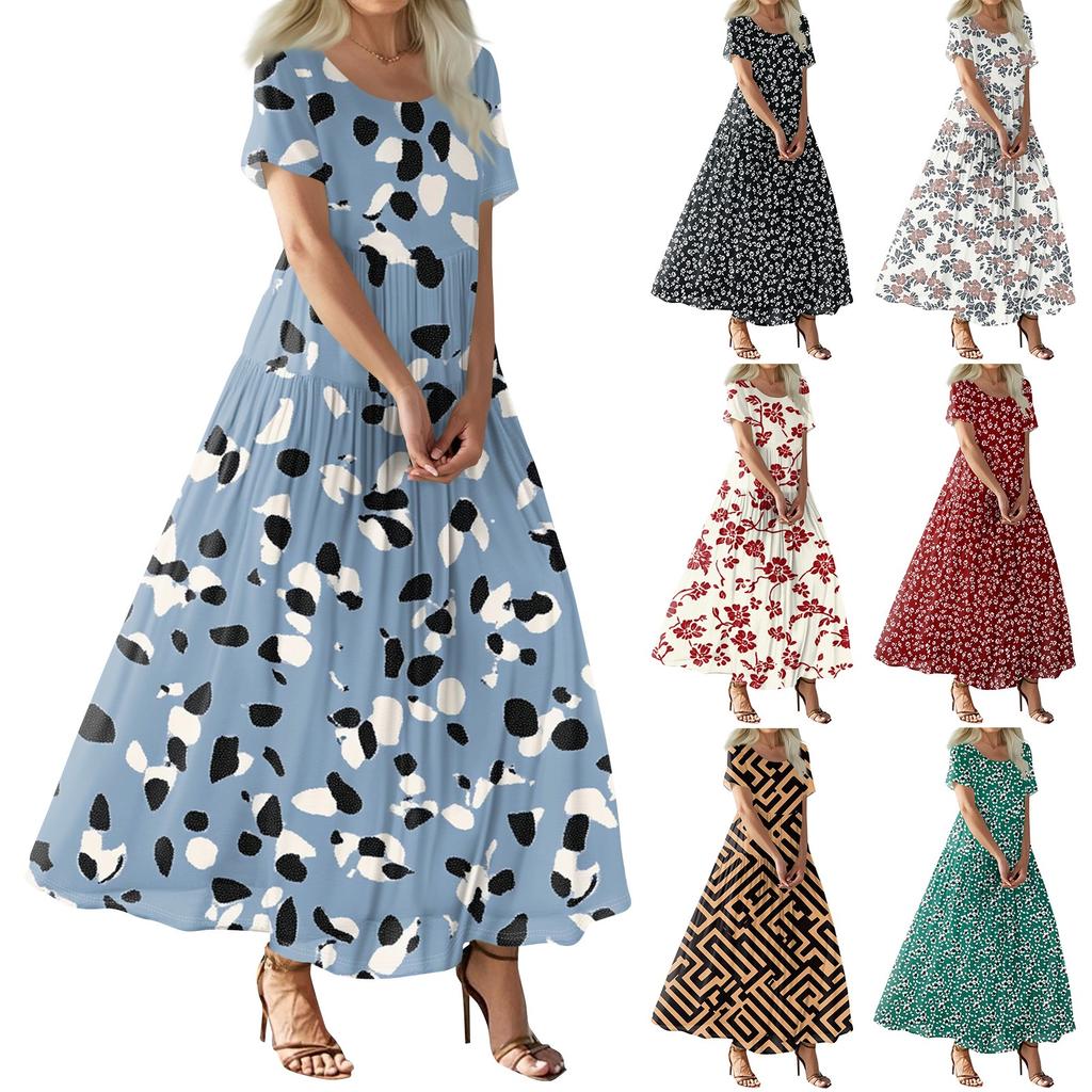 Women's Summer Casual Floral Print Short Sleeve O Neck High Waist A Line Tiered Flowy Boho Maxi Dress We can guarantee that the overall displayed in the photography is accurate, however there may be differences in how the appears during wear. This depends on other physical variables, e.g. personal body size, body shape, limb proportion, height, etc. Description: MATERIAL: Our short-sleeve summer dresses feature a skin-friendly, soft, and elastic fabric that is breathable, does not shrink, and offers exceptional comfort, providing you with a delightful wearing experience. MATCHING: Pair with and a denim jacket for a relaxed day, or to a and heels for work. Add jewelry and heels for nights out, or sandals and a crossbody bag for weekends. OCCASION: This dress is versatile for various occasions like everyday wear, casual outings, work, evening events, weekend gatherings, beach trips, vacations, and travel adventures. Gender:Women Material:Polyester Dress Length:Knee-Length Decoration:None Silhouette:A-Line What you get:1 X Dress Note: Due to possible physical differences between different monitors, the product photography is illustrative and may not precisely reflect the actual color of the item received