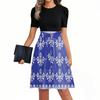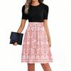 Women's Fashionable Casual Belt Short Sleeved Round Neck Printed Patchwork Dress