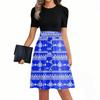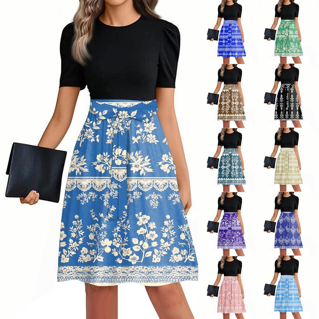 Women's Fashionable Casual Belt Short Sleeved Round Neck Printed Patchwork Dress — buy online with free worldwide shipping!